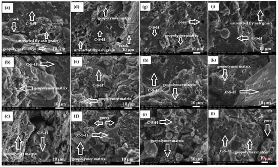 Microstructure of geopolymers in magnification 1000x: (a) 10MDN10%, (b) 10MDK10%, (c) 10MDN15%, (d) 10MDK15%, (e) 10MDN30%, (f) 10MDK30%, (g) 14MDN10%, (h) 14MDK10%, (i) 14MDN15%, (j) 14MDK15%, (k)14MDN30%, (l)14MDK30%.