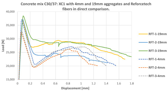 The behavior of the RFT Reforcetech minibars after the first peak (failure point) is different from the BCS. The BCSs have a somewhat more definitive curve than the RFT fibers, and a quicker post failure force drop down. The RFT result shows that concrete containing RFT fibers has more strength than other fiber-mixed concrete, as shown in Figure 8 and Figure 9. In RFT, the distribution is better than in BCS and the RFTs show similar results regardless of the mix’s grain size. It can be concluded that RFT significantly increases the workability of concrete mixes.