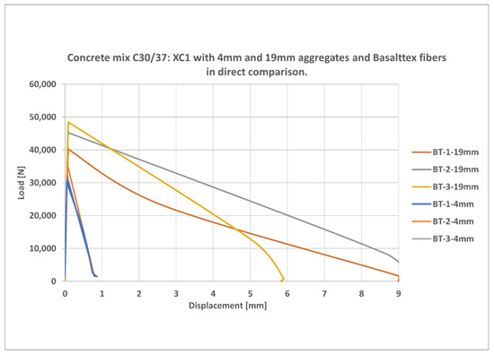 The BCS 17-25.4-KV1 generally has an interesting result. The negative part would be that it is porous and appears to soak up most of the water in the solution, so that the mix’s workability is steadily decreasing. Additionally, in the bending tensile test, the impact of fiber varied significantly with the size of the aggregates in the concrete mix. The question raised here is whether the BCS distribution in the mixing process depends on when it is added to the mix, and furthermore, before applying to the blend, whether it would saturate the fibers in water, assist the process of even delivery and have less effect on the mix’s water content. In all cases, the post-failure behavior is apparent. However, on the positive side of the BCS, it is important to see how the elongation persists in the 19 mm grain concrete with considerable force, whereas the 4 mm grain concrete is more brittle, fractures, and disintegrates directly after break. The peak load value of BCS in the 19 mm grain size combination is considerably higher than in any other sample type in this study.