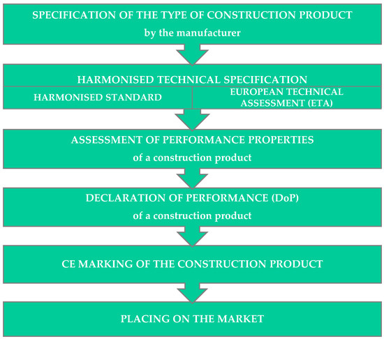 In Poland, the regulation was introduced by the Act of 16 April 2004 on construction products [6], which defines the rules for placing construction products on the market. It approximates the executive acts and laws of all EU Member States relating to construction products. Pursuant to Article 5 of this Act, a construction product covered by a harmonized technical specification, i.e., a harmonized standard or European technical assessment (ETA), may be placed on the market or made available on the internal market only and exclusively in accordance with the provisions of the CPR [4].