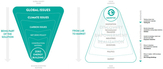 The MEZeroE project aims to create an ecosystem combining infrastructural facilities and the knowledge of academic and research centers, and innovative solutions proposed by the industry in the form of a multilateral virtual market, open to the exchange and use of knowledge and experience between stakeholders from the construction industry. The ecosystem aims to provide ready-made services in the fields of modeling, testing and monitoring nZEB Enabler Envelope Technologies Solutions (nEESs), while creating a comprehensive knowledge management and training environment (Figure 2).
