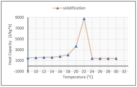 The preliminary results of the PCM tests based on a new procedure and the non-standard use of the FOX 314 apparatus allowed estimations that the phase change in the tested material takes place close to the temperature declared by the manufacturer. The maximum heat capacity of a gypsum board with PCM was 8772 J/kgK, and in terms of volumetric capacity, it was 7.15 MJ/m3K. The authors of the article [8] obtained, in the case of a gypsum board containing 25% paraffin-based PCM, ca. 6 MJ/m3K. The heat capacity values of the tested material during melting and solidification were not identical, showing the hysteresis effect. Solidification took place at a lower temperature than melting, while the maximum heat capacity values obtained were almost identical. Both observations differ from the characteristics of Micronal itself, obtained from the DSC study. The material containing PCM already in the liquid phase has a lower heat capacity than in the solid phase. A similar result was obtained by the authors of [8].