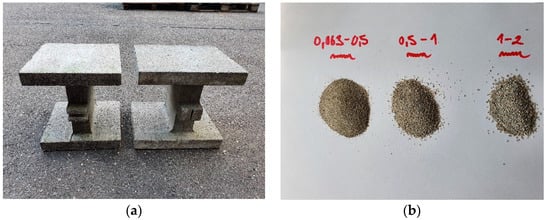 Metashale precursors were activated by a mix of potassium alkalis: potassium water glass with a K2O/SiO2 ratio = 1.7 and potassium hydroxide to avoid efflorescence, which occurs upon activation by sodium water glass/hydroxide [15]. The filler—a recycled cementitious aggregate—was of a grain size within the range of 0.063 to 2 mm, prepared by crushing damaged structural formworks. The H-shaped structural formwork (Figure 3a) was first crushed into smaller pieces using an EDB 400 mechanical press. Subsequently, smaller pieces were crushed using a crusher with 2.2 mm maximum jaw distance. The resulting aggregate was sieved and sorted into individual fractions of 0.063–0.5 mm, 0.5–1 mm and 1–2 mm, following the pattern of standardized quartz sand fractions (Figure 3b). The fresh mixture was supplemented with a small amount of carbon fibers to examine their influence on the electrical properties of the designed composite.