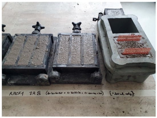 First, Mefisto L05 and Ron D460 HR precursors were mixed with three waste aggregate fractions. Pellets of carbon fibers were dispersed in water with non-ionic surfactant Triton X-100 and siloxane-based air-detraining agent Lukosan S to reduce the surface tension of the carbonaceous admixture and defoam the suspension. The vessel with the suspension was then treated in an ultrasonic bath for 10 min to effectively crumble the pellets and disperse individual fibers. The well-prepared suspension was poured into a dry mixture of precursors, aggregate, and alkali activator and mixed for 10 min. Fresh mortar was finally placed into molds (Figure 4): 160 × 40 × 40 mm3—mechanical properties, 100 × 100 × 100 mm3—electrical properties, 70 × 70 × 70 mm3—thermal properties. The 100 × 100 × 100 mm3 samples were additionally embedded with copper-grid electrodes using a 3D-printed plastic board for precise positioning. After 24 h of curing in laboratory conditions (22 °C, 50% RH), samples were unmolded and left in equal conditions for a further 28 days. The composition of the studied geopolymer is summarized in Table 2.