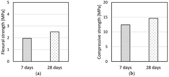 The flexural and compressive strengths at 7 d and 28 d are summarized in Figure 5. An increase in flexural strength from 2 MPa to 2.5 MPa and 12.5 MPa to 15 MPa in compressive strength was observed. The relatively low strength values were mainly due to the use of a significant amount of waste metashale binder, as well as fine waste aggregate (input waste materials ~85 wt.%). The decrease in the strength of cementitious and geopolymer composites due to the substitution of natural aggregate with waste counterparts is well known and mentioned in the literature, e.g., Nuaklong et al. [18], who investigated fly ash geopolymers with limestone and recycled aggregate, observing that the recycled aggregate led to a reduction in strength from 40 MPa to 30.6 MPa. Zaid et al. [19] studied natural aggregate replacement with recycled aggregate in steel-fiber-reinforced concrete and concluded that with an increasing amount of the recycled aggregate, the strength of the composites decreased. It was justified by a higher porosity of the recycled aggregate, resulting in an increase in material drying shrinkage and the formation of microcracks.