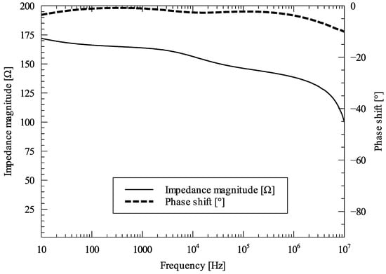 AC electrical properties represented by the frequency-dependent magnitude of the impedance and phase shift are presented in Figure 6. The magnitude of the impedance, involving both the resistive and capacitive component (resistance, capacitance), decreased from the initial ~175 Ω (10 Hz) to ~100 Ω (10 MHz), which due to the low values, revealed the potential for new functional properties, such as self-heating. The phase shift was from −3° to −10° in the tested frequency range and a noticeable decrease was observed at higher frequencies of 1–10 MHz. The phase shift close to 0° confirmed the resistive nature of the mortar and its potential for the self-heating function in an AC electric field. Since the DC electrical conductivity of the mortar (σ = 3.9·10−2 S·m−1) was reasonably high, the self-heating potential was confirmed also in a DC electric field.