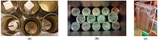 Cylindrical mortar specimens with central placed steel rod were divided into three groups after curing time: the first was to be irradiated and second and third to be stored in the laboratory without irradiation. The two groups of specimens were placed in steel cans, as shown in Figure 1a. The third group was conditioned without canning. Subsequently, each group of specimens was placed in a CTS climate-controlled chamber (65% RH and CO2 concentration of 1% in the air). Specimens were conditioned in open cans in the climate chamber for 24 h and then the cans were closed. The environmental conditions in the cans were designed for two RH—fully water-saturated condition and RH = 50 ± 5% (controlled by superabsorbent polymer). The third group of specimens, after 24 h of conditioning without a can, was cured under laboratory conditions (23 ± 1 °C and RH = 43 ± 5%).