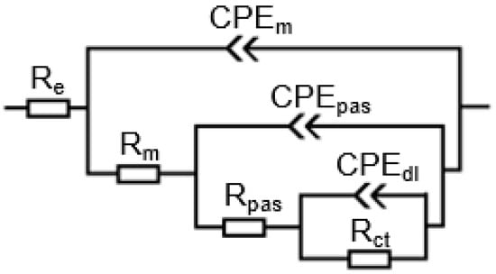 The equivalent circuit (Figure 2) for the analysis of the obtained EIS spectra was chosen under the assumptions described in a previous study [18]. The following parameters were determined on the basis of the measurements: