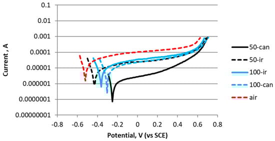 Polarization curves for steel rebar embedded in Portland cement mortar (50/100—RH value; ir—irradiated; can—in a can in a climatic chamber; air—laboratory conditions).
