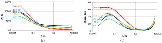 EIS spectra: (a) impedance, (b) phase shift for steel in mortars (points—measurement data; lines—fitting for equivalent circuit from Figure 2; 50/100—RH value; ir—irradiated; can—in a can in a climatic chamber; air—laboratory conditions).