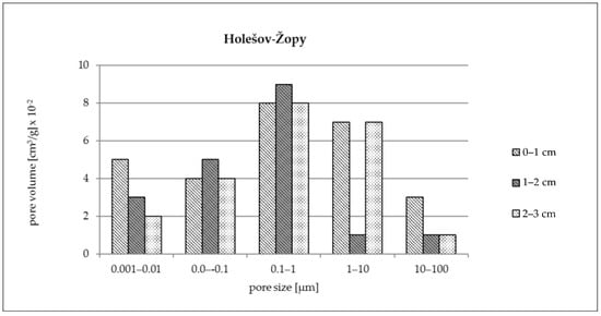 Pore size distribution of individual layer of the brick Holešov-Žopy (0–1 cm, 1–2 cm, 2–3 cm from the cover).