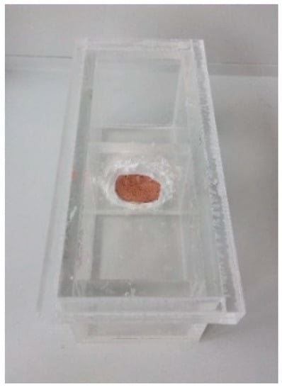 A two-compartment box made of plexiglass was used (see Figure 4). Initially, dry brick discs were sealed with silicone in a circular aperture cut in the plexiglass panel, splitting the box into two chambers. One of the chambers (chamber 1) was filled with 500 mL of distilled water, while the other chamber (chamber 2) was filled with calcium solution of the desired concentration (500 mL).