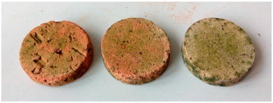 Biodegradation of fired bricks has been described in many studies performed in situ and also under laboratory conditions. The presence of algae, cyanobacteria and fungi [13,14,15] was studied. Their colonization depends on many factors, such as humidity, the amount of light, nutrients and also the structure of the surface of building materials on which organisms can create and maintain biofilm growth, e.g., Ref. [16]. So far, the influence of the degree of the firing of bricks on their ability to be bio-colonized has never been investigated.
