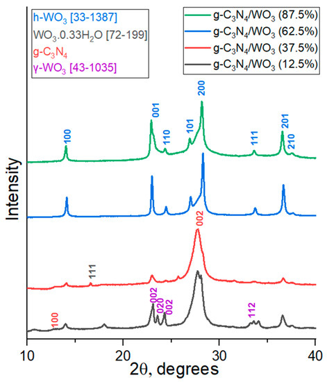 Based on PXRD results (Figure 2), g-C3N4/WO3 composites contain both tungsten oxide and graphitic carbon nitride phases. Two diffraction peaks at 13.3° and 27.5° corresponding to (100) and (002) planes confirm the presence of the g-C3N4 phase in the samples. There are no peaks on the pattern that could be attributed to the phase of melamine cyanurate or other derivative phases of carbon nitride, which means that the g-C3N4 structure was not significantly changed during the hydrothermal treatment.
