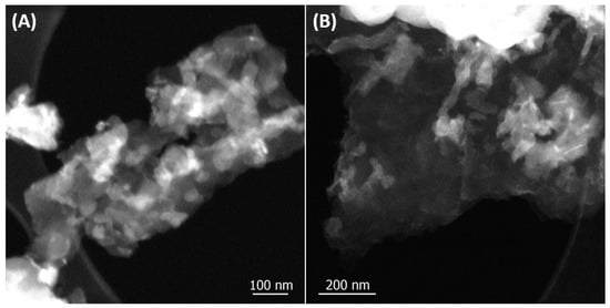 HADF STEM images of g-C3N4/WO3 sample containing (A) ω(WO3) = 37.5% and (B) ω(WO3) = 12.5% after hydrothermal treatment.