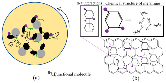 Melamine (250 mg) was dissolved in 75 mL of DMF by stirring for 15 min. Then, GNP (250 mg) was added, and the mixture was ultrasonicated for 15 min. For functionalisation, the resulting solution was shaken and ball-milled for 24 h (Figure 1a). Melamine was bound by π–π interactions with GNP (Figure 1b). The hexagonal rings of melamine were adsorbed onto the surface of GNP. Then, the mixture was vacuum-filtered for 45 min. The retained black solid particles were vacuum-dried at room temperature.