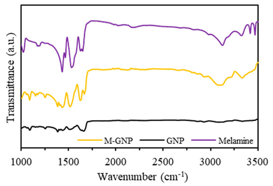 GNP functionalisation is verified by spectroscopic analysis. The FTIR spectra of melamine, pristine GNP, and melamine-GNP are shown in Figure 2. The melamine and the functionalised M-GNP spectrum displayed significant signals, at about 1620 and 3310 cm−1, which indicated the presence of N–H bonds. In addition, peaks of C-O stretching and C=C stretching of the pristine GNP were located on the M-GNP at 1590 and 1075 cm−1. These peaks confirmed the functionalisation of the GNP surface by the low-energy ball-milling process [10,11,13,14]. Furthermore, a stretched broad peak appeared at about 3090 cm−1, as O–H bonds in chemically modified M-GNP were generated from the mechanochemical ball-milling and shaking process [11].