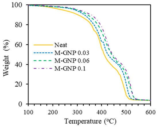 The thermal stability of the 3DPM-GNP nanocomposites was investigated via TGA. Figure 4 displays the TGA curves of M-GNP nanocomposites. Neat sample began to lose weight before M-GNP nanocomposites. Table 1 lists the decomposition temperatures for the weight loss of 5 wt% and the residual weight at 400 °C, designated as T5 and W400, respectively. These results indicate that the incorporation of M-GNP considerably enhances the thermal stability of the polymer matrix. The T5 of the nanocomposite containing 0.1 wt% M-GNP was 304 °C with 29% greater than that of the neat one. Similarly, the residual weight at 400 °C was 77 wt%, while for the pure material, this value was 56 wt%, an increment of 38% for the 0.1 wt% M-GNP nanocomposite. The improvement in thermal stability with such a small amount of M-GNP was owing to the good interfacial adhesion between M-GNP and the 3D-printed polymer matrix since the noncovalent functionalisation of melamine via π–π interactions improved the dispersion of the GNP, which also enhanced the UV curing reaction with the dimethacrylate-based photocurable resin [14].