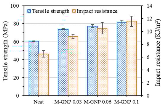 The tensile and impact properties of the 3DP parts are shown in Figure 5. The tensile strength and impact resistance values were increased with increasing content of M-GNP; hence, with the incorporation of 0.1 wt% of M-GNP, the tensile strength and impact resistance reached their maxima. For instance, compared with the neat material, the tensile strength and impact resistance of the 0.1 wt% M-GNP nanocomposite were improved by 35% and 78%, respectively.