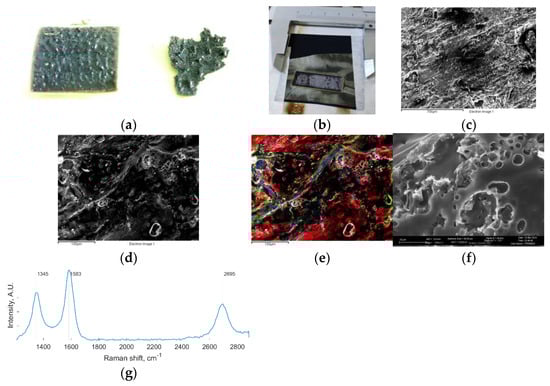 (a) Back side of the LIG-S with remaining SPEEK droplets; (b) LIG-S onto CP at the end of the laser scribing process; (c) Low magnification FESEM of the LIG-S surface; (d) Intermediate magnification FESEM of the LIG-S surface; (e) EDX map of (d) showing carbon (red), oxygen (green), and sulfur (blue); (f) High magnification FESEM of the LIG-S surface; (g) Raman spectrum of LIG-S: D peak ~1350 cm−1, G peak ~1580 cm−1, and 2D peak ~2700 cm−1.