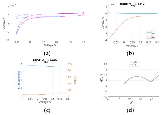 (a) CV at a 10 mV/s scan rate in nitrogen and oxygen shows ORR activity. Both RRDE and GDE setups returned a curve with identical features. Here, only the GDE one is reported; (b) RRDE disk and ring current comparison; (c) average detected number of electrons involved in the ORR (left axis) and percentage of reduced HO2– (right axis); (d) RRDE Nyquist plot showing an evident charge transfer.