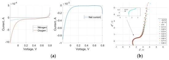 (a) LSV at 5 mV/s scan rate in nitrogen, oxygen, and net current in the GDE setup; (b) GDE Nyquist plot showing a more sluggish charge transfer than in the RRDE setup.