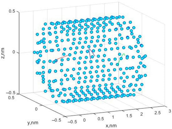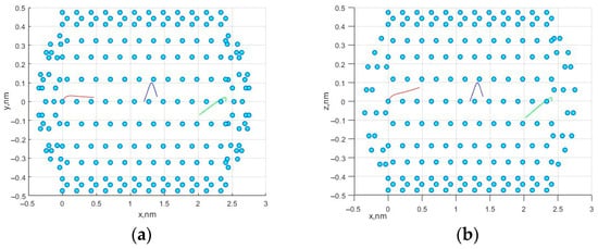In the course of modeling the motion of molecules, the following initial configurations of the system were used. The positions of the carbon atoms that make up the nanotube were strictly specified and did not change during the simulation. The initial coordinates for the three methane molecules were given as already described in the previous section. The initial velocity components for three molecules were given and amounted to 10 m/s along each of the axes, which, in total, gave values of the velocity vectors of 10√3 m/s. The number of time steps was n = 105, with the step size dt = 2 × 10−7 ns. Figure 1 shows the movement of three methane molecules in a simulated nanocell. Figure 2a,b shows the trajectories in the x0y and x0z planes.