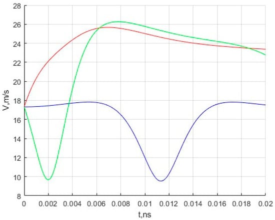 Dependence of the speed of methane molecules on time. The red color indicates the speed of the first molecule, the blue color indicates the speed of the second, and the green color indicates the speed of the third.