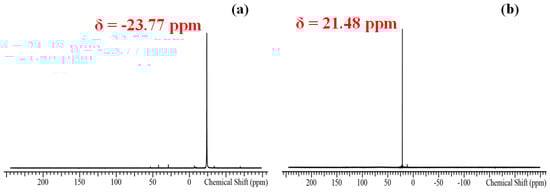 The characterization of TDMAPTe and TOPTe was performed using 31P NMR spectroscopy. In the case of TOPTe, one signal at δ = −23.77 ppm (solvent, C6D6) was observed, as shown in Figure 1a. This indicated that the precursor solution consisted of a mixture of TOPTe and TOP. The ability to detect the pattern of pure TOPTe in the presence of unreacted TOP was not available []. A signal for TOPO at δ = 43.8 ppm (solvent, C6D6) was not observed []. For TDMAPTe, one pattern was shown at δ = 21.48 ppm (solvent, C6D6), agreeing with the formation of TDMAPTe/TDMAP mixture in THF. No signals for pure TDMAPTe at δ = 58.8 ppm (solvent, C6H6) or pure TDMAP at δ = 123 ppm (solvent, C6H6) were detected [,], as shown in Figure 1b.