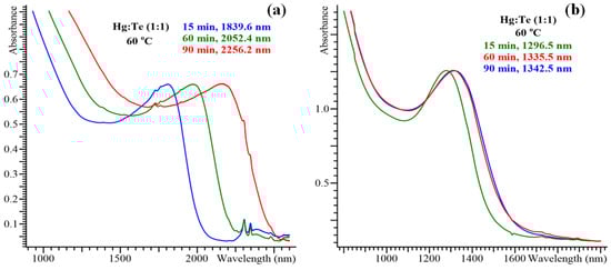 Characterization of the obtained HgTe NCs was performed using UV–Vis–NIR spectroscopy, Fourier-transform infrared spectroscopy (FT-IR), Raman spectroscopy, X-ray photoelectron spectroscopy (XPS), transmission electron microscopy (TEM) and selected area electron diffraction (SAED). The quantum confinement effect was observed in the N-IR spectra, Figure 2a,b, of prepared NCs through the red-shifting of the first excitonic peak to a longer wavelength when size increased [,,]. In addition, infrared spectra of HgTe CQDs in TCE demonstrated that the chemical reactivity of TDMAPTe/THF is higher than that for TOPTe/TOP. The first excitonic peak of the synthesized quantum dots was ~1297 nm after 15 min of reaction time with narrow size distribution (FWHM~214 nm). A red-shifting occurred to ~1336 nm after 60 min, although no considerable shift was shown later (Table 1).