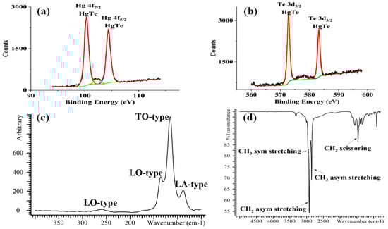 HgTe CQDs are materials sensitive to oxygen in the air; therefore, X-ray photoelectron spectroscopy (XPS) was used to determine the chemical structure of the prepared nanocrystals. The XPS spectrum, Figure 3a,b, revealed two spectral lines of 4f7/2 and 4f5/2 for Hg in HgTe at binding energies of 100 and 104 eV. Two other peaks of 3d5/2 and 3d3/2 for Te in HgTe at binding energies of 573 and 583 eV were observed, respectively [,]. No signals attributed to the heavy oxidation of Te−2 to Te+4, such as HgTeO3 or TeO2 (paratellurite), were shown. Raman spectroscopy was also used in order to identify the obtained nanocrystals. A thin film of mercury telluride CQDs on a glass substrate was prepared by employing a drop-cast route. The measurement was between 50 and 500 cm−1. The observed phonon lines were as follows: a phonon of longitudinal acoustic (LA) at 88.31 cm−1; a phonon of transverse optic (TO) at 116 cm−1; two phonons of longitudinal optic (LO) at 136 cm−1 and at 259 cm−1 as a weak signal (Figure 3c). This result agreed well with the findings in reference []. The shell was investigated using Fourier-transform infrared spectroscopy (FT-IR). The measured FT-IR spectrum, the 5000–1000 cm−1 region in Figure 3d, revealed C–H stretching of methylene and methyl groups at 2955 cm−1, 2922 cm−1, and 2852 cm−1. Methylene groups exhibited bending at 1467 cm−1. No band of free thiol at 2595 cm−1 was observed [].