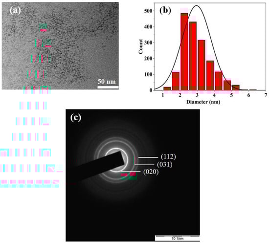 The TEM image revealed that the synthesized HgTe CQDs are sphere-shaped with a mean size distribution of ~3 nm, as shown in Figure 4a,b. Analysis of selected-area electron diffraction (SAED) showed that the prepared HgTe nanocrystals had a tetragonal crystal structure with lattice planes of (020), (031), and (112) that matched well with Miller indices of HgTe (COD No. 96-152-3885) [].