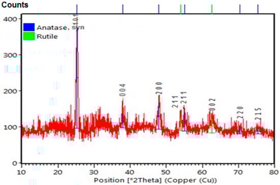 X-ray diffraction (XRD) was used to determine the crystallinity of the NPs (Figure 2). The pattern confirms that the biosynthesized TiO2 NPs are crystalline. The XRD pattern shows eight strong, broad peaks across the entire 2θ range with prominent peaks at 25.29°, 37.98°, 47.98°, 53.99°, 55.02°, 62.65°, 70.43°, and 73.3° attributed to the (101), (004), (200), (211), (211), (002), (220), and (215) crystal planes, respectively. The pattern also shows that the material is a mixture of anatase and rutile. The major plane of anatase is observed to be the plane (101) while the major plane of rutile is observed to be the plane (211). These findings are consistent with ICDD file Nos. 01-083-2243 (Anatase) and 00-004-0551 (rutile) [9]. The major peak at 25.29° in the XRD pattern of the synthesized NPs corresponds to the TiO2 anatase (101) crystallographic plane. Using Debye–Scherrer’s Equation (Equation (2)), the average crystallite size of the TiO2 NPs was determined from the XRD pattern [10]: