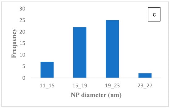 (a) FE-SEM images and (b) EDX image of synthesized TiO2 NPs, and (c) Histogram of TiO2 NP size distribution.