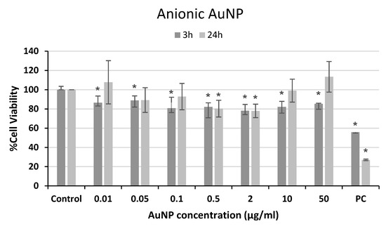 Cell viability of human neuroblastoma SH-SY5Y cells after exposure to anionic AuNPs for 3 and 24 h. PC: positive control (1% Triton 100-X). * p < 0.05, significant difference compared to the corresponding negative control.