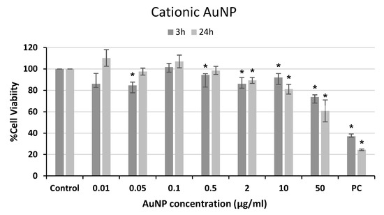 Cell viability of human neuroblastoma SH-SY5Y cells after exposure to cationic AuNPs for 3 and 24 h. PC: positive control (1% Triton 100-X). * p < 0.05, significant difference compared to the corresponding negative control.
