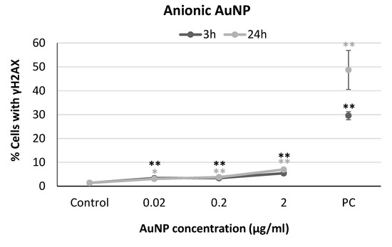 Results from yH2AX analysis in SH-SY5Y cells exposed to anionic AuNPs for 3 and 24 h. PC: positive control (1 µg/mL BLM). * p < 0.05, ** p < 0.01, significant difference compared to the corresponding negative control.