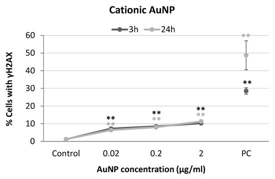 Results from yH2AX analysis in SH-SY5Y cells exposed to cationic AuNPs for 3 and 24 h. PC: positive control (1 µg/mL BLM). ** p < 0.01, significant difference compared to the corresponding negative control.