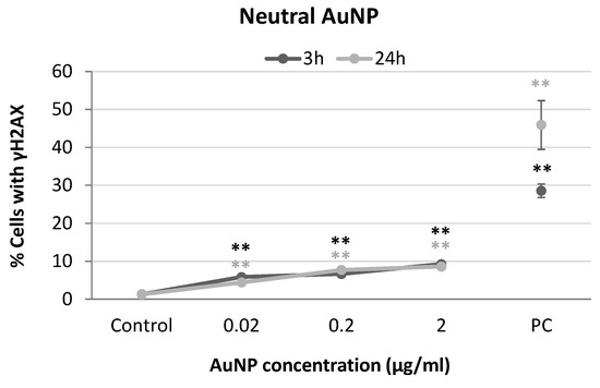 Results from yH2AX analysis in SH-SY5Y cells exposed to neutral AuNPs for 3 and 24 h. PC: positive control (1 µg/mL BLM). ** p < 0.01, significant difference compared to the corresponding negative control.