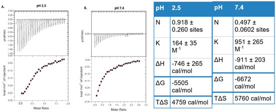 ITC results showing the thermodynamic interaction between hybrid cubosomes and POPG liposomes. (A) Buffer pH 2.5. (B) Buffer pH 7.4. The table shows the results obtained in applying the single set of binding sites model to the integrated heat released.