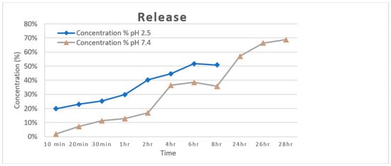 Figure 2 shows the different in vitro release properties for acemannan bioactive. At pH 2.5, the release was higher from the beginning of the experiment, and it reached approximately 50% at 6 h. This result indicates an initial burst release followed by an attenuated release over time in the gastric condition. In pH 7.4, the release was more attenuated during the whole experiment, reaching about 70% release only at 28 h, suggesting a prolonged and sustained release in the intestinal condition. Polymeric nanoparticles of pH-sensitive characteristics behave differently in each pH, presenting a tendency of structural change [14]. These properties can help the release to be greater at pH 2.5, in which polymeric particles tend to expand in size, thus leaving the nanopores of the cubosome free, which is why they present a greater exchange of liquid from the exterior to the interior of the cubosome. Moreover, the rheological properties and the density of the macromolecules can affect the passage of transported bioactives through the entangled shell [15].