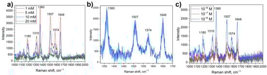 (a) SERS spectra of R6G on Ag/titania nanosheets substrates obtained with silver nitrate solutions of various concentrations; (b) The stability of SERS signal throughout the surface of Ag/titania nanosheets substrate obtained using 10 mM AgNO3 solution: dark blue line indicates mean signal, light blue area represents the deviation from the mean signal; (c) SERS spectra of R6G with different concentrations on Ag/titania nanosheets (10 mM AgNO3).