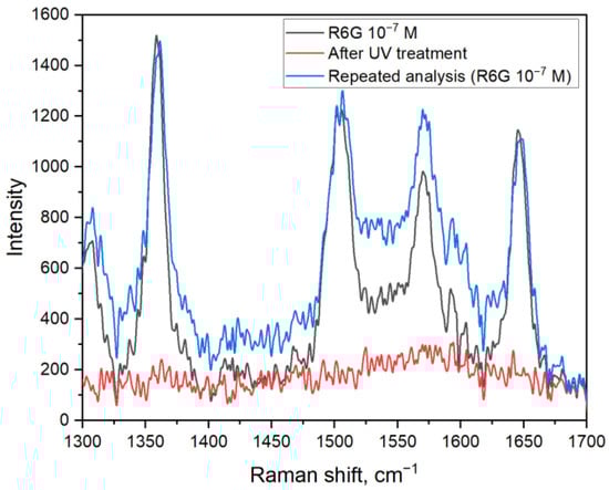To characterize the sensor abilities of Ag/titania nanosheets substrates R6G solutions with different concentrations were chosen for SERS analysis. It is shown that when using the substrates, it is possible to detect rhodamine 6G solutions with concentrations down to a level of 10−8 M (Figure 3c), which corresponds to an enhancement coefficient of (2.5 ± 0.6) × 106.To show the possibility to use Ag/titania nanosheets substrates multiple times, experiments with UV cleaning were conducted (Figure 4). It is shown that after the irradiation of the substrate, there is no rhodamine 6G signal to be detected. Such observation can be explained by the photodegradation of organic molecules in the presence of titania and materials based on it. Moreover, a strong binding between silver nanoparticles and titania nanosheets allows substrate pre-cleaning by deionized water. After UV treatment, which decomposes absorbed organic molecules, a new portion of the analyte can be placed onto the substrate and detected with the same efficiency. With that, the intensity of the peaks corresponding to R6G remains at the same level. It is worth noting that there is an increase in the signal intensity in the range of 1510–1560 cm−1 when comparing the first and second analyses. That can be explained by the oxidation of silver nanoparticles during the analysis, which, however, does not prevent from qualitative detection of R6G molecules by this method.