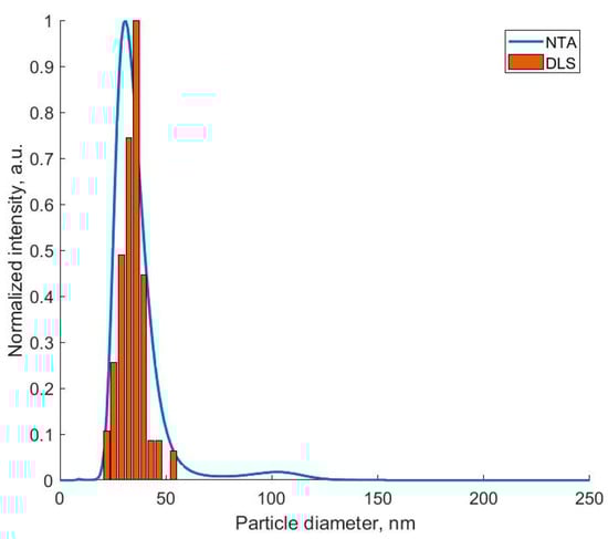 The DLS and NTA methods make it possible to obtain a more statistically reliable estimate of the particle size spread due to a larger number of analyzed particles. Despite the fact that the calculation of the hydrodynamic radius in both methods is carried out in the approximation for particles of a spherical shape, the values of the peak half-width in the particle size distribution makes it possible to estimate the degree of monodispersity of the samples (Figure 3). It can be seen that the values obtained using different methods are in fairly good agreement with each other; however, the sizes obtained using the NTA method had a greater deviation due to the ability of each particle to analyze tracks.