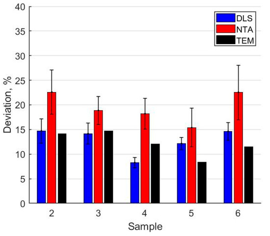 Relative deviation of particle sizes based on DLS, NTA, and TEM measurements.