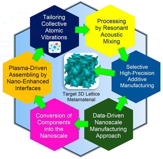 In particular, this chain includes a combination of a set of the following techniques: the conversion of all components into the nanoscale; the plasma-driven functionalization and assembling of components via multilayer nano-enhanced interfaces; the excitation of the allotropic phase conversions, driven by energy; the micro- and nanoscale manipulations assisted by surface acoustic waves during ion-assisted pulse plasma processing and functionalizing; pulse-plasma doping via atoms of various chemical elements; exciting oriented self-assembly by using high-frequency electromagnetic fields; the resonant acoustic mixing of all nanocomponents; growing high-end ELM elements via high-precision multi-material additive manufacturing as well as using the data-driven nanoscale inverse designing and manufacturing strategy. The developed technological chain is schematically shown in Figure 2.