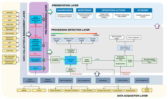The system architecture is designed to provide a comprehensive and integrated approach to enhancing the safety of tailings storage facilities. As shown in Figure 2, it comprises several interconnected layers, each playing a vital role in ensuring the efficient and effective analysis, modeling, and presentation of TSF data.