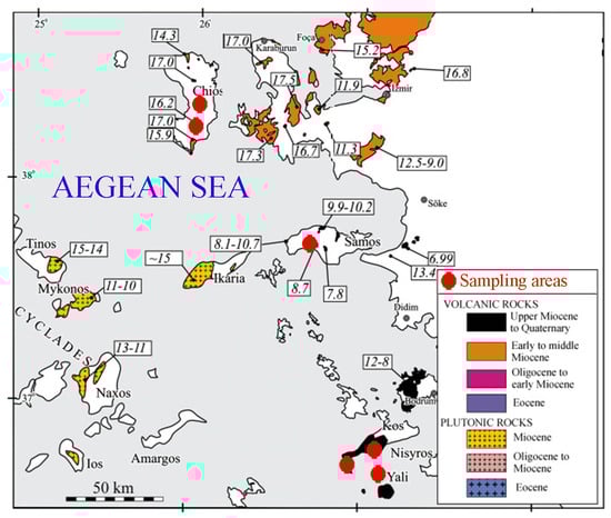 - Pe-Piper, G.; Piper, D.J.W.; Kotopouli, C.N.; Panagos, A.G. Neogene volcanoes of Chios, Greece. The relative importance of subduction and back-arc extension. Geol. Soc. Lond. Spec. Publ. 1994, 81, 213–232. [Google Scholar] [CrossRef]