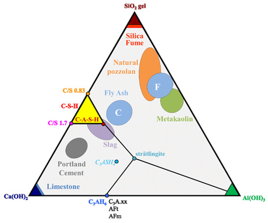 The Ca-Si-Al ternary diagram (Figure 2) presents the different average compositions of Portland cement, limestone, and supplementary cementing materials (SCMs) [27]. All studied samples are plotted into the field of the natural pozzolan composition.