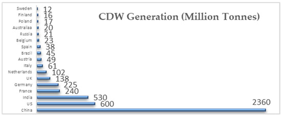 Illustration of the countries with the highest CDW generation around the world in 2018 (processed data from Wang et al. [4]).
